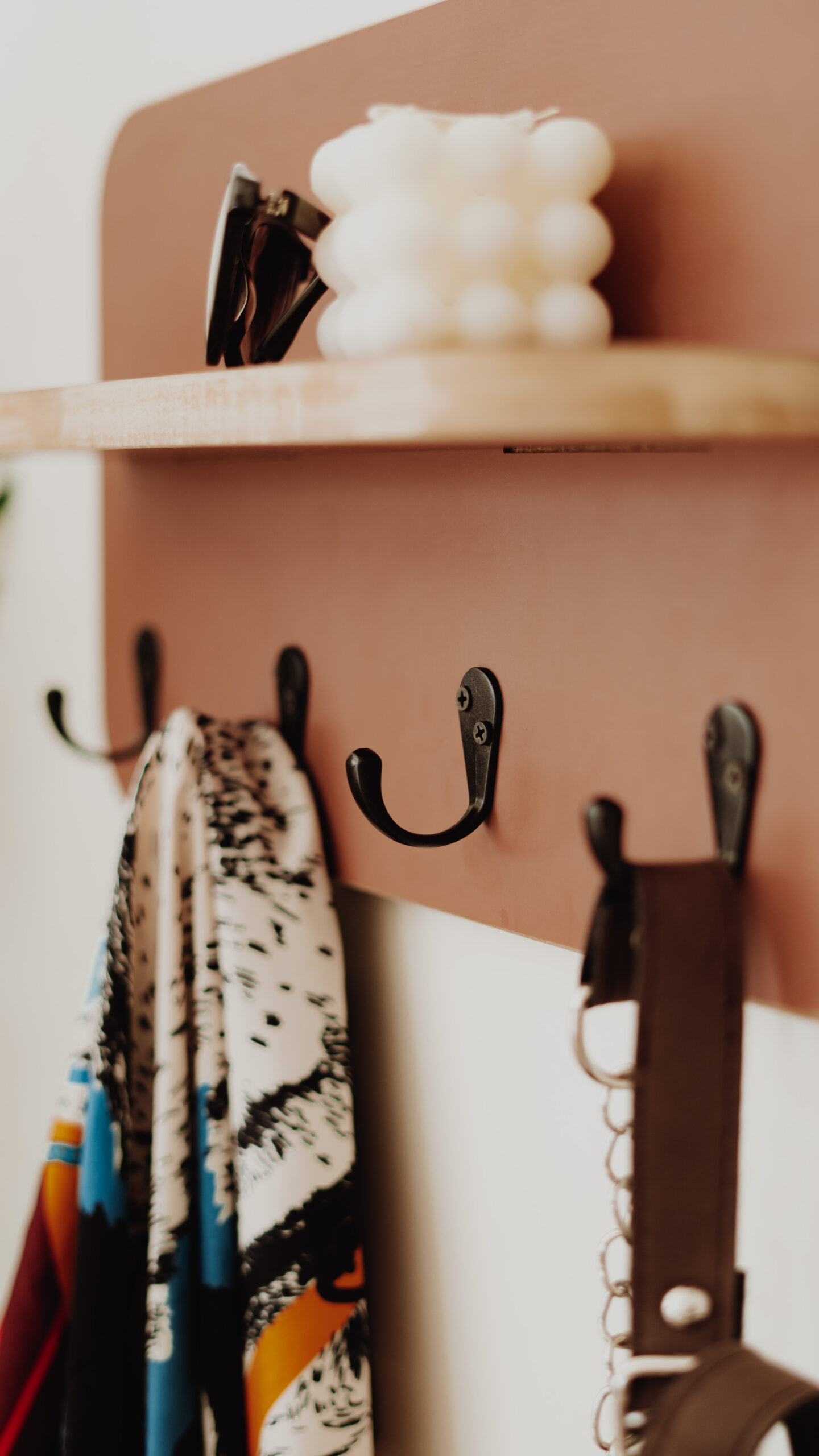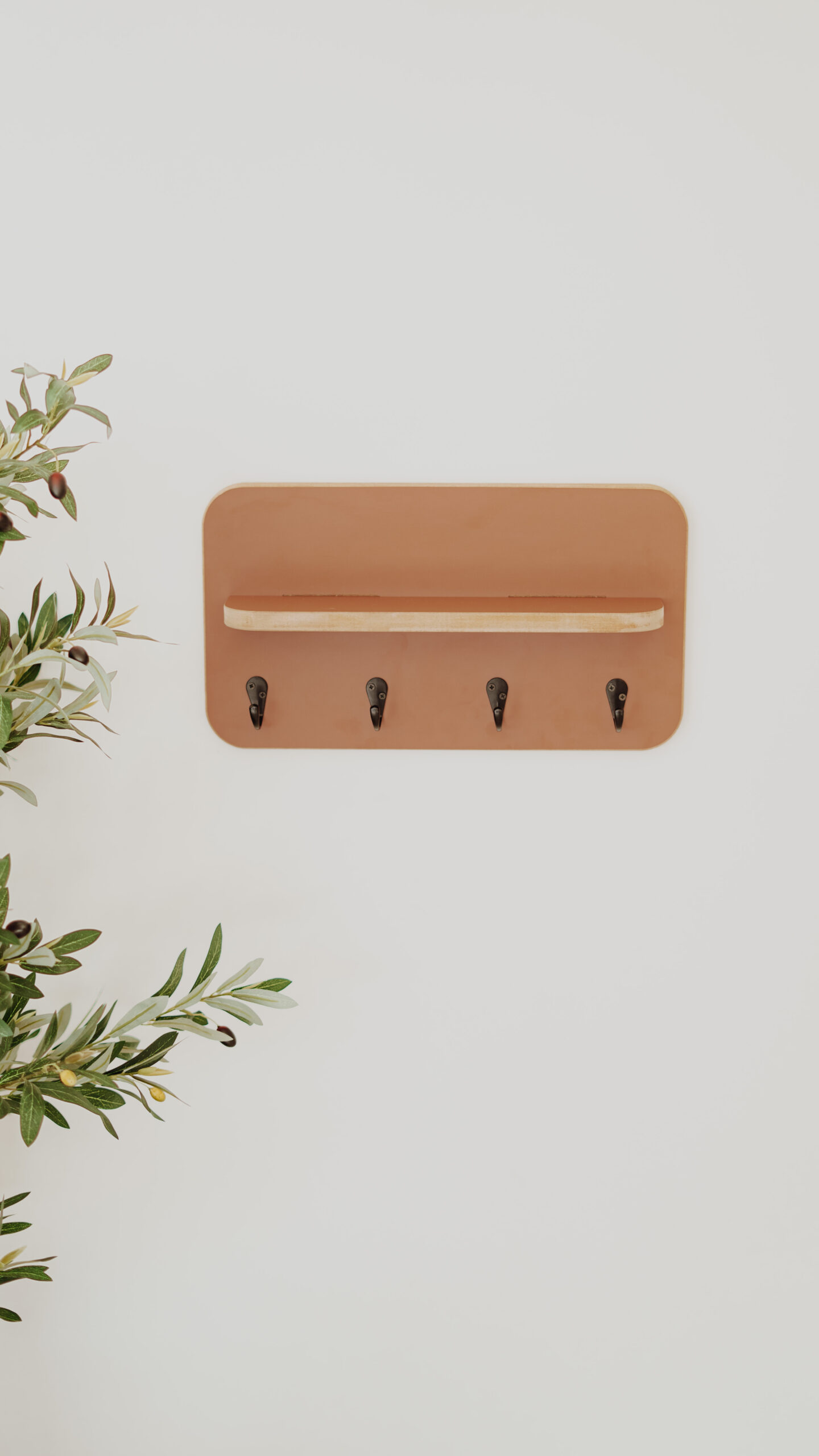 Recibidor perchero con 4 colgadores resistentes de metal pintados de color negro y estante para apoyar deco
